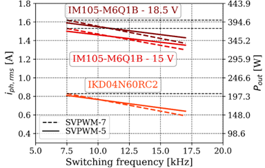 圖9所示為輸出功率能力。圖中的輸出功率計(jì)算考慮了PF為0.75且調(diào)幅指數(shù)為1。顯而易見(jiàn),IM105-M6Q1B的輸出功率幾乎是IKD04N60RC2驅(qū)動(dòng)板的兩倍,這也證明其功率密度更高。相比于在Vgs=15V條件下的測(cè)試,在這項(xiàng)測(cè)試中,柵極電壓增至約Vgs=18.5V,這使得輸出功率增加了6%。