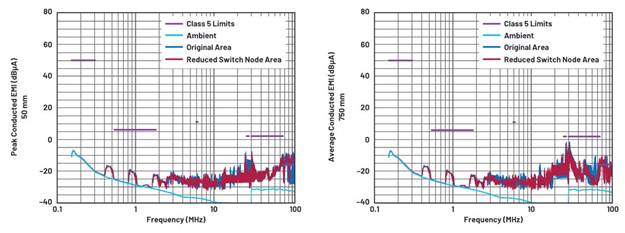高dV⁄dt開關(guān)節(jié)點是一個噪聲源,會產(chǎn)生電容耦合,增加CE中的CM EMI噪聲。它也像天線一樣工作,向空間輻射電磁噪聲,也會影響輻射EMI。因此,盡可能減小PCB布局上的開關(guān)節(jié)點面積可以改善EMI性能。為了在PCB電路板上測試這一點,我們切除了部分銅芯,并將電感移動到更靠近IC的位置(如圖7所示),以此減小開關(guān)節(jié)點面積。我們測試了切除銅芯之前和之后的EMI,測試結(jié)果如圖8所示。