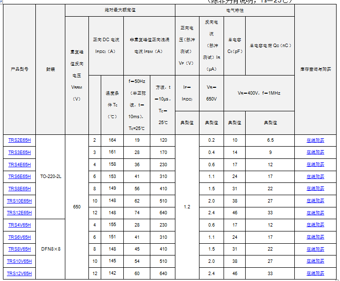 - 低反向電流:TRS6E65H IR=1.1μA(典型值)(VR=650V)
