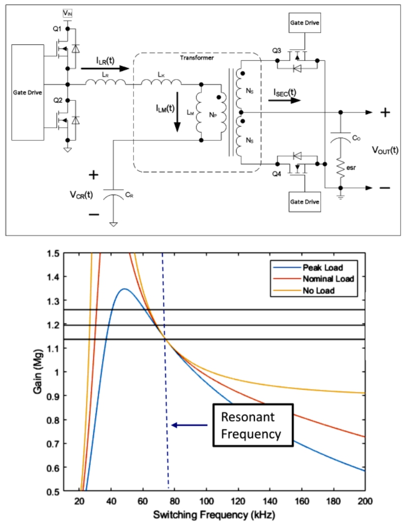 這種配置有幾個(gè)優(yōu)點(diǎn)。首先,它通過利用線圈和電容器之間的諧振來提供高效率,從而降低開關(guān)損耗。此外,變壓器提供的電氣隔離允許轉(zhuǎn)換器的輸入和輸出分離,從而保護(hù)控制電路并允許調(diào)整變壓器變比。從增益響應(yīng)曲線圖中可以看出,根據(jù)開關(guān)頻率的不同,存在三種不同的情況。