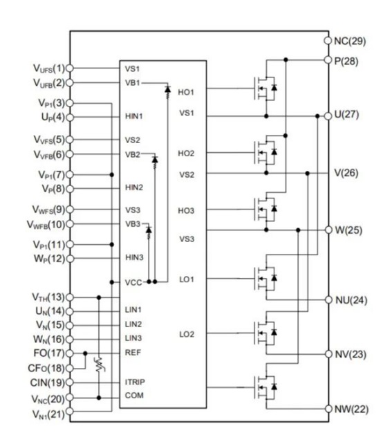 IPM29- SiC_MOS智能功率模塊新產(chǎn)品內(nèi)部集成了新一代N溝道增強(qiáng)型1200V-SiC_MOSFET芯片與與優(yōu)化的SOI工藝6通道柵極驅(qū)動(dòng)芯片,作為緊湊的1200V等級(jí)封裝,這款SiC MOSFET IPM使用簡(jiǎn)便,針對(duì)SIC定制優(yōu)化驅(qū)動(dòng)部分,有效減小開關(guān)振蕩。此外,它采用緊湊式封裝,得益于使用具備很高熱導(dǎo)率的DBC基板,具有良好熱性能和充足的電氣隔離等級(jí)能力,具有出色的功率密度、可靠性和性能。它針對(duì)相關(guān)應(yīng)用進(jìn)行了優(yōu)化,是一款用于高效率的電機(jī)驅(qū)動(dòng)與有源功率校正電路的高效逆變平臺(tái)而設(shè)計(jì)的個(gè)性化產(chǎn)品。例如供暖通風(fēng)空調(diào),風(fēng)扇電機(jī),車載空調(diào)及三相功率因數(shù)校正。