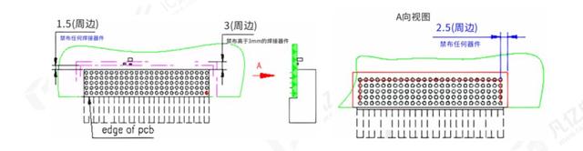 1)常規(guī)后焊器件(接插件),同層布局時(shí),器件保證和接插件1.5mm及以上間距,背面布局器件時(shí),保證至少3mm及以上間距要求。插拔器件或板邊連接器周圍3mm范圍內(nèi)盡量不布置SMD器件,以防止連接器插拔時(shí)產(chǎn)生的應(yīng)力損傷器件,如圖1-4所示。