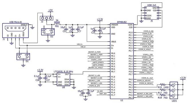 以下原理圖摘錄顯示了 EFM8 及相關電路: