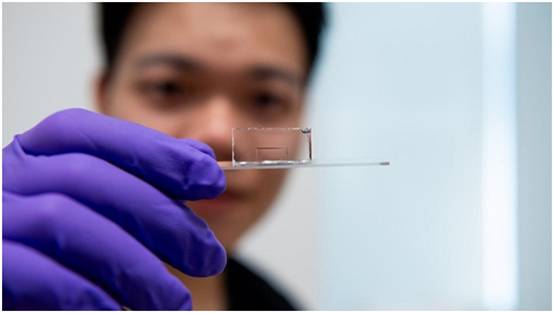 芝加哥大學(xué)科學(xué)家開發(fā)出一種只有幾個(gè)原子厚度的玻璃晶體,可以捕獲和攜帶光。圖為研究人員拿著這種材料。 圖片來(lái)源:Jean Lachat/物理學(xué)家組織網(wǎng)