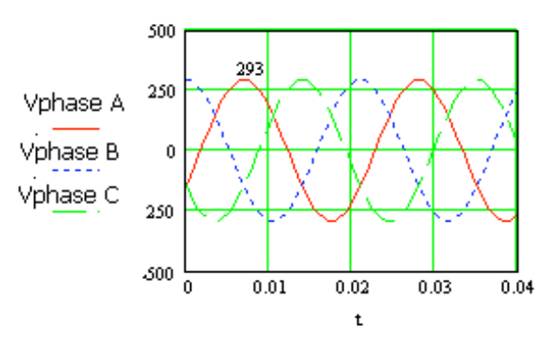 圖 2 208VAC/60Hz 系統(tǒng)的各相電壓與時間的關(guān)系