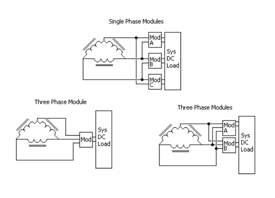 單相模塊具有更簡單、更高效的電源轉(zhuǎn)換電路的優(yōu)點,但為了完全平衡線路電流,電源轉(zhuǎn)換器必須以三的倍數(shù)來實現(xiàn)。在各個電源模塊尺寸和整體系統(tǒng)負(fù)載之間找到合適的配合有時可能具有挑戰(zhàn)性。如果模塊為公共負(fù)載供電,則必須在模塊之間采用功率共享電路,以確保從每相汲取的功率相等。功率共享電路可以采用“下垂”共享電路的形式,其中小的非耗散合成阻抗與每個模塊的輸出串聯(lián)添加。這將迫使模塊共享電流,就好像一個單元的電流大于其他單元一樣,其輸出電壓將下降,直到其負(fù)載電流與系統(tǒng)中的其他單元匹配。或者,單線,