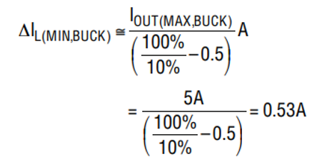不過,在計(jì)算最大 RSENSE 電阻之前,必須確定電感紋波電流。如果主電感 L 未知,則可通過將 ΔIL(MIN,BUCK) 選擇為降壓區(qū)中最大電感電流的10% 來估算紋波電流ΔIL(MIN,BUCK),公式如下: