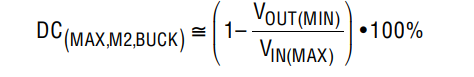 式中的 DC(MAX,M2,BUCK) 是 M2 開關(guān)在降壓區(qū)中的最大占空比百分?jǐn)?shù),其由下式給出: