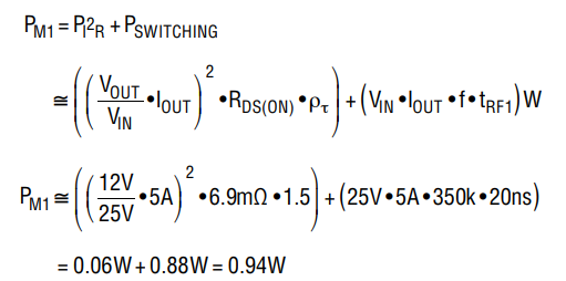 可通過選擇一個(gè)較低的開關(guān)頻率來降低 0.88W 的最大開關(guān)功耗。由于該計(jì)算是近似的,因此應(yīng)在 PCB 上測量實(shí)際的上升和下降時(shí)間以獲得更好的功耗估計(jì)。當(dāng)電路工作于降壓區(qū)時(shí),M2 中的最大功率耗散出現(xiàn)在最大輸入電壓下。若采用 6.9mΩ FDMS7672,則功率耗散為: