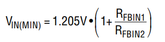 通過在 VIN、FBIN 和 GND 之間連接分壓電阻,F(xiàn)BIN 引腳可提供一種用于調(diào)節(jié)輸入電壓或創(chuàng)建欠壓閉鎖功能的方法。請參閱 “方框圖” 中的誤差放大器 A3,當(dāng) FBIN 低于1.205V 基準(zhǔn)時(shí),VC 會拉低。例如,倘若 VIN 由一個(gè)阻抗相對較高的電源 (即:太陽能板) 提供,且吸收電流把 VIN拉至一個(gè)預(yù)設(shè)限值以下,則 VC 將被降低,從而減小從輸入電源吸收的電流并限制電壓降。請注意,在強(qiáng)制連續(xù)模式中(MODE 引腳為低電平)使用該功能會導(dǎo)致從輸出吸收電流并迫使其進(jìn)入輸入端。如果不需要這種運(yùn)行方式,則使用不連續(xù)或突發(fā)模式操作。如需設(shè)定最小輸入電壓或輸入電壓穩(wěn)壓值,可采用下式: