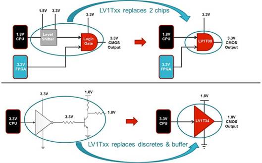 為了使兩個設(shè)備可靠地連接,輸出驅(qū)動器電壓必須與接收器輸入閾值兼容。為了在混合電壓系統(tǒng)中滿足這一條件,通常需要電壓轉(zhuǎn)換器。通常,電壓轉(zhuǎn)換是使用邏輯 IC 以及有時使用多個分立組件來完成的。這會增加電路板尺寸、元件數(shù)量和組裝成本。