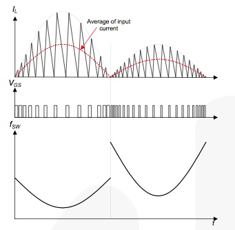 圖 4 顯示了 MOSFET 導(dǎo)通時間和開關(guān)頻率如何隨著輸出功率降低而變化。當負載減小時,如圖 4 右側(cè)所示,峰值電感器電流會隨著 MOSFET 導(dǎo)通時間的縮短而減小,因此開關(guān)頻率會增加。由于這會在輕負載條件下導(dǎo)致嚴重的開關(guān)損耗,并且啟動時可能會出現(xiàn)過高的開關(guān)頻率操作,因此 FL7930B 的開關(guān)頻率被限制為 300kHz。由于具有可變開關(guān)頻率的 BCM PFC 轉(zhuǎn)換器的濾波器和電感器的設(shè)計應(yīng)在頻率條件下進行,因此值得研究 BCM PFC 轉(zhuǎn)換器的頻率如何隨工作條件變化。