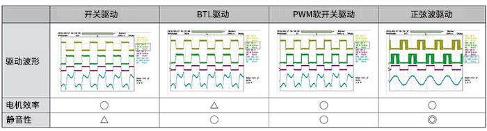 而正弦波驅(qū)動則具有可通過外部電壓來調(diào)整PWM軟開關(guān)區(qū)間的線圈電流的功能,因此可使線圈電流的波形變得平緩以接近正弦波?蛇M(jìn)一步減少線圈電流的波形失真,從而實(shí)現(xiàn)更出色的靜音性。