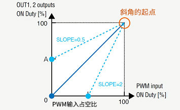 搭載了可通過SLOP引腳對PWM輸入占空比和輸出占空比的斜率特性進(jìn)行設(shè)置的功能。這是對輸入和電機(jī)轉(zhuǎn)速的特性進(jìn)行調(diào)整時使用的非常方便的功能?稍0.5~2之間對輸出占空比的斜率進(jìn)行調(diào)整。下圖為PWM輸入的示例。