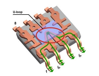 ACS71x 設(shè)備中的當(dāng)前路徑。電流沿任一方向通過 U 形環(huán)路并繞過霍爾元件 (X)。U 形環(huán)安裝在 SOIC8 封裝中的芯片下方。