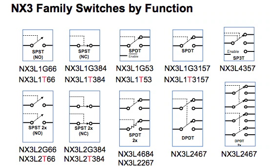 極數(shù)表示公共端子(或活動(dòng)觸點(diǎn))的數(shù)量,而擲數(shù)表示公共側(cè)可以連接的備用端子的數(shù)量。每個(gè)封裝中的開關(guān)可以是單開關(guān)、雙開關(guān)或多個(gè)開關(guān)(通常是偶數(shù))。這些開關(guān)可以單獨(dú)激活,也可以同時(shí)激活。恩智浦高性能模擬開關(guān)產(chǎn)品組合包含采用上述每種配置的設(shè)備。NX3 系列提供所有標(biāo)準(zhǔn)配置 SPST、SPDT……單、雙、四。