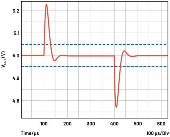 當需要嚴格調(diào)節(jié)的電源電壓時,可以利用開關(guān)穩(wěn)壓器數(shù)據(jù)手冊中的直流電壓精度規(guī)格。該精度值通常為±1%或±0.5%。如果電壓轉(zhuǎn)換器在反饋路徑中使用外部電阻分壓器,進行電壓精度計算時必須要包含電阻的容差。此外,除了直流精度外,還必須考慮動態(tài)電壓精度。如果發(fā)生負載瞬變,即負載突然消耗高電流,則生成的電壓可能會低于或高于設(shè)定點電壓,然后穩(wěn)定在設(shè)定點水平。此行為取決于控制環(huán)路的速度。對于必須嚴格調(diào)節(jié)電源電壓的應(yīng)用,在此類負載瞬變期間通常也需要提供精密電壓。圖1顯示了發(fā)生負載瞬變后時域中的典型電壓響應(yīng)?梢钥吹,100μs后連接了一個負載,400μs后斷開了該負載。