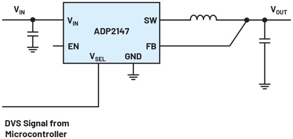 圖2.通過VSEL引腳實現(xiàn)簡單DVS的降壓穩(wěn)壓器