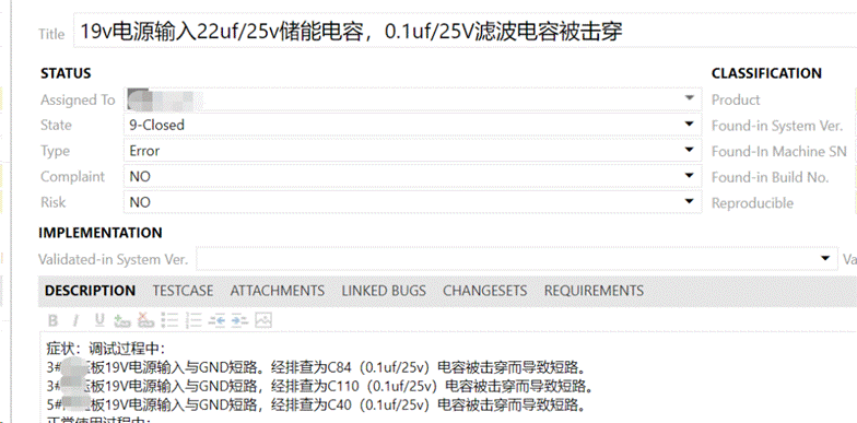 進一步排查發(fā)現(xiàn)均是MLCC電容失效,對失效MLCC進行測量發(fā)現(xiàn)均為短路失效模式。板卡供電是19V供電,而選取的電容均為25V耐壓,在插拔設備適配器時,19V電壓會產(chǎn)生2-3V的毛刺。已經(jīng)接近所使用電容的耐壓極限參數(shù)。因此比較容易損壞。