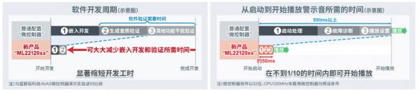 新產(chǎn)品是由硬件構(gòu)成的,與由微控制器構(gòu)成的產(chǎn)品相比,無(wú)需進(jìn)行軟件驗(yàn)證,可以大幅縮短開發(fā)周期。此外,新產(chǎn)品可以用簡(jiǎn)單的命令進(jìn)行控制,與由微控制器生成聲音的普通方式相比,用不到1/10的時(shí)間即可發(fā)出警示音。除此之外,新產(chǎn)品還配有故障檢測(cè)功能,可檢測(cè)與主控微控制器之間的通信異常以及由外置元器件引起的異常振蕩,有助于提高應(yīng)用產(chǎn)品的可靠性。