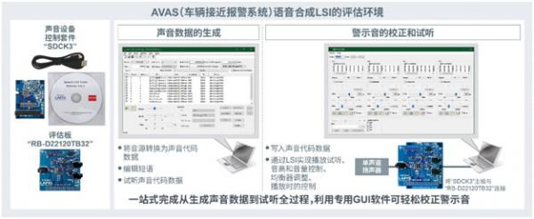 評(píng)估板“RB-D22120TB32”和專用GUI(Graphical User Interface)軟件通過(guò)聲音設(shè)備控制套件“SDCK3”的形式提供。利用該套件,客戶可輕松評(píng)估從生成音頻數(shù)據(jù)到校正和試聽警示音的一系列過(guò)程。