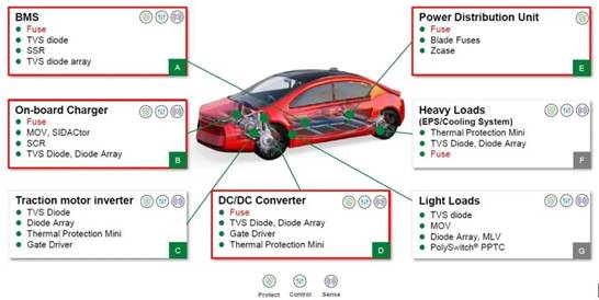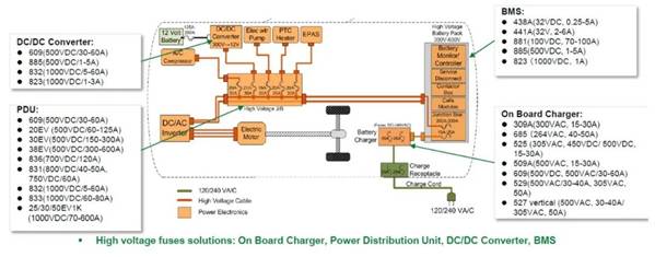 Littelfuse作為全球保護器件的領(lǐng)導(dǎo)品牌,汽車硬件回路的過壓過流保護產(chǎn)品自然也少不了,保險絲做為過流保護器之一,在電池管理系統(tǒng)、車載充電機、配電單元、直流變換器等應(yīng)用最為廣泛,其中電池管理系統(tǒng)采用貼片保險絲,其余使用引線或鎖螺栓保險絲。另外控制板與信號端口等為了提高重復(fù)使用率可以采用PTC熱敏電阻作為過流保護,又叫自恢復(fù)保險絲。