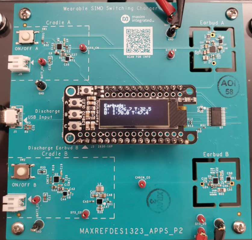 圖4顯示了MAX77659參考設(shè)計的完整PCB。該設(shè)計包括兩對充電座/耳機解決方案,其中一對采用MAX77659 SIMO PMIC設(shè)計(充電座/耳機A),另一對采用典型的線性充電器設(shè)計(充電座/耳機B),使用MAX77734線性充電器;迳系陌粹o可切換A和B分支的充電,OLED顯示屏顯示耳機的MAX17260電量計測得的充電電流和溫度。屏幕還顯示充電器狀態(tài),以及充電器何時因過熱必須降低充電電流。
