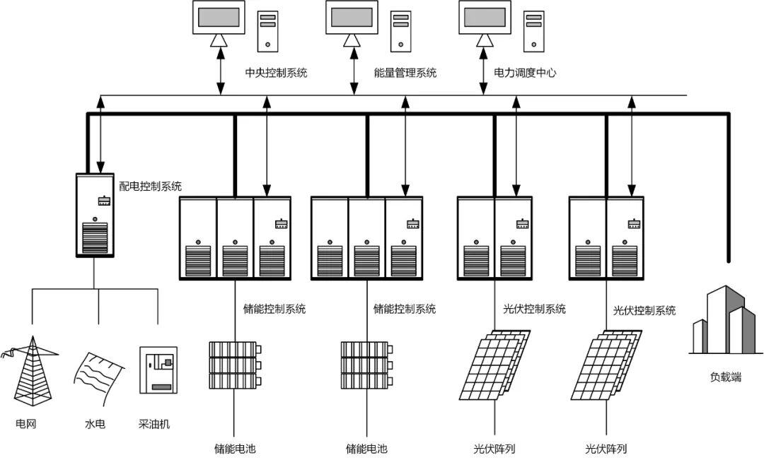 光伏微電網(wǎng)系統(tǒng)架構(gòu),包含儲(chǔ)能、光伏等,構(gòu)件主要由儲(chǔ)能系統(tǒng)與監(jiān)控調(diào)度管理系統(tǒng)、光伏控制系統(tǒng)等組成;其中監(jiān)控與調(diào)度管理單元包括中央控制系統(tǒng)、能量管理系統(tǒng)、電力調(diào)度中心等。