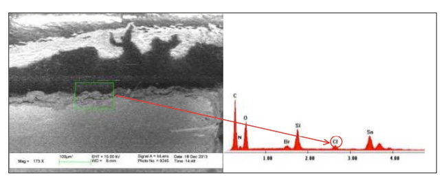 鹵化物是離子性的并且?guī)в须姾桑焕纾珻l‐、Br‐ 和 F‐。氯是電負(fù)性強(qiáng)的離子,該物質(zhì)通過 Vcc(電源)電勢引起的電場漂移遷移到封裝中。Vcc(電源)焊盤通常是個受到氯相關(guān)問題“攻擊”的焊盤。一般來說,GND(地)焊盤一般不會被腐蝕,因為該焊盤一般處于地電位或電位。Vcc(電源)焊盤通常是個受到氯相關(guān)問題“攻擊”的焊盤。一般來說,GND(地)焊盤一般不會被腐蝕,因為該焊盤一般處于地電位或電位。這表明不需要對鉛模具界面進(jìn)行分層以使離子污染物進(jìn)入。僅僅存在離子物質(zhì),在存在水分和電位差等加速因素的情況下,足以啟動離子污染過程。圖 1 顯示了環(huán)境中的氯離子如何進(jìn)入封裝并腐蝕焊盤的機(jī)制。圖 2 顯示在引線框架與模制化合物(未分層)之間的界面處發(fā)現(xiàn)了氯,圖圖3顯示了由于使用鹵化物助焊劑而導(dǎo)致的焊盤腐蝕。