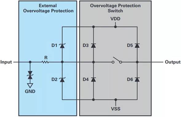 通常,常見的簡單設(shè)計(jì)方法是使用外部保護(hù)二極管,通常是瞬態(tài)電壓抑制器(TVS)二極管,安裝在信號線和電源線或接地線之間。TVS二極管相當(dāng)有用,因?yàn)樗麄兛梢钥焖賹λ矐B(tài)的電壓峰值作出反應(yīng)。圖1左側(cè)所示的就是這種類型的外部過壓保護(hù)。
