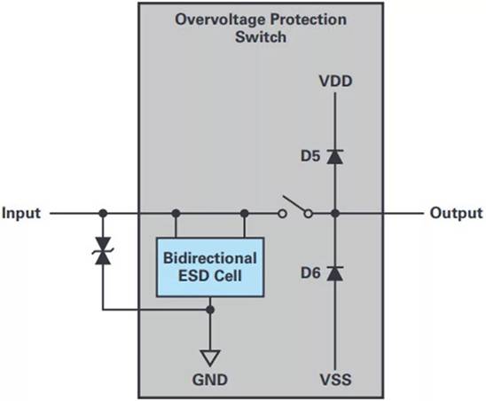 圖2. 配有集成式雙向ESD單元的過壓保護(hù)。