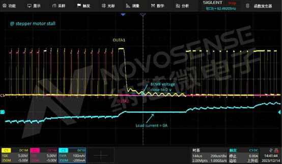 步進電機在運行狀態(tài)下,反電勢和相電流存在特定關系,可以反應步進電機的運行狀態(tài)。NSD8381-Q1內置點電機的反電勢檢測模塊,會在每個周期的電流過零點,對電機反電勢進行采樣。通過反電勢電壓和內置閾值電壓對比,判斷電機運行狀態(tài)。