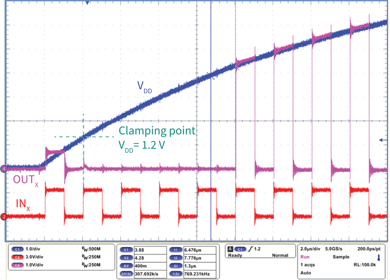 圖5將輸出電壓有源箝位(EiceDRIVERTM 2EDNxx3x)的輸出波形與市場(chǎng)上的類(lèi)似器件在弱上拉條件下的無(wú)源箝位輸出波形進(jìn)行了對(duì)比。如圖所示,EiceDRIVERTM 2EDNxx3x性能更加可靠,在VDD啟動(dòng)期間使OUT電壓保持在安全的低電平。