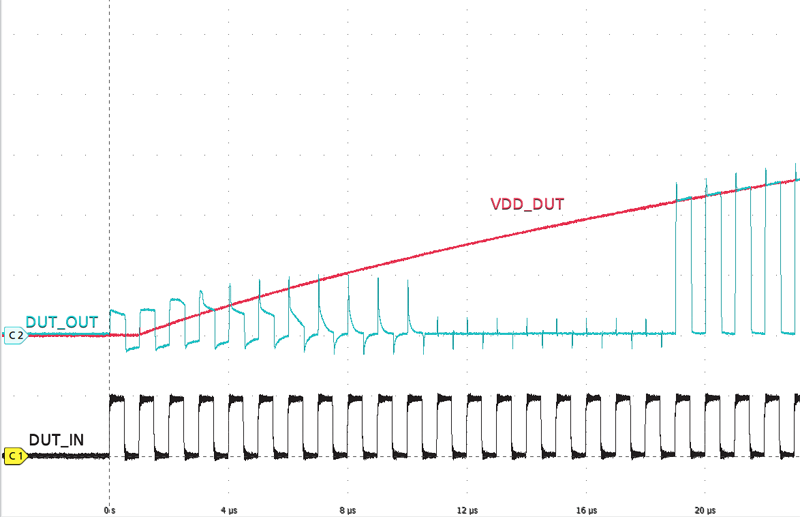 市場(chǎng)上大多數(shù)柵極驅(qū)動(dòng)IC的UVLO啟動(dòng)時(shí)間為5µs或更長(zhǎng)。全新EiceDRIVERTM 2EDN柵極驅(qū)動(dòng)IC的UVLO啟動(dòng)時(shí)間(tSTART)為1.8µs(典型值),因此,在解除UVLO時(shí)僅丟失最少數(shù)量PWM脈沖,從而實(shí)現(xiàn)安全的轉(zhuǎn)換器啟動(dòng)和可靠運(yùn)行。圖7所示為UVLO恢復(fù)過(guò)程中的tSTART實(shí)測(cè)數(shù)據(jù)。
