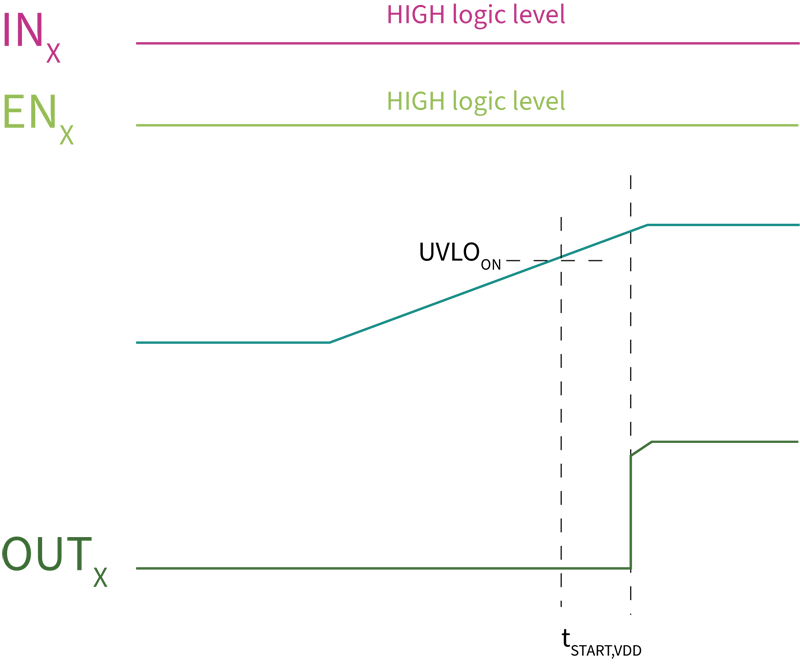 在系統(tǒng)啟動(dòng)過(guò)程中,或從欠壓狀態(tài)恢復(fù)時(shí),驅(qū)動(dòng)器從UVLO狀態(tài)恢復(fù)所需時(shí)間tSTART至關(guān)重要。事實(shí)上,當(dāng)系統(tǒng)從UVLO狀態(tài)恢復(fù)時(shí),MCU和柵極驅(qū)動(dòng)IC有不同的電源,MCU會(huì)在UVLO解除之前向驅(qū)動(dòng)器發(fā)送PWM脈沖。在這種情況下,在驅(qū)動(dòng)器電源電壓升至高于閾值(UVLOON)之前,可能會(huì)部分或完全丟失幾個(gè)脈沖。