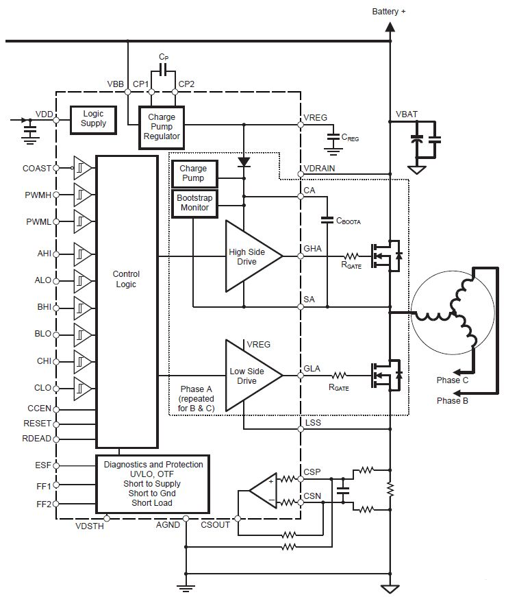 集成診斷提供了欠壓、過溫及功率橋故障指示?蓪⑺鼈兣渲贸稍诖蠖鄶(shù)短路情況下保護功率 FET。詳細(xì)診斷可通過串行數(shù)據(jù)詞的形式提供。