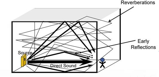聲波在室內(nèi)傳播時,會被墻壁、天花板、地板等障礙物反射,每經(jīng)過反射一次都會被障礙物吸收一些。當(dāng)聲源停止發(fā)聲后,聲波在室內(nèi)要經(jīng)過多次反射和吸收,最后才消失。因此我們可以感覺到,當(dāng)聲源停止發(fā)聲后還有若干個聲波混合持續(xù)一段時間,即室內(nèi)聲源停止發(fā)聲后仍然存在的聲延續(xù)現(xiàn)象,這種現(xiàn)象叫做混響,這段時間叫做混響時間。