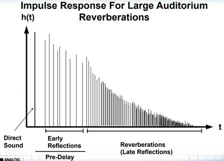 對于模擬現(xiàn)實生活的中混響,試想一下,如果我們在一個房間里面對面地交談,因為聲音在房間里面的反射是無處不在的,在開始溝通的過程中,會有最開始的一部分直達(dá)聲進(jìn)入我們的耳朵,這時它的能量是最高的。隨后通過各種各樣的反射,聲音的能量得到衰減后慢慢進(jìn)入到我們的耳朵,這個時間和能量的表現(xiàn)就像是一個個脈沖,所以在這里描述它就是脈沖響應(yīng)類的其中一種混響。那么在實現(xiàn)上,如何達(dá)到這種接近現(xiàn)實的混響效果呢?