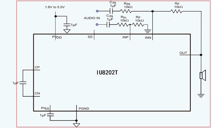 IU8202T采用單端模式輸出,其直驅(qū)模式結構單電源供電時能夠產(chǎn)生以地為參考的輸出,從而省 去了大尺寸的隔直電容,既節(jié)省了成本和電路板空間, 也降低了元件的高度。