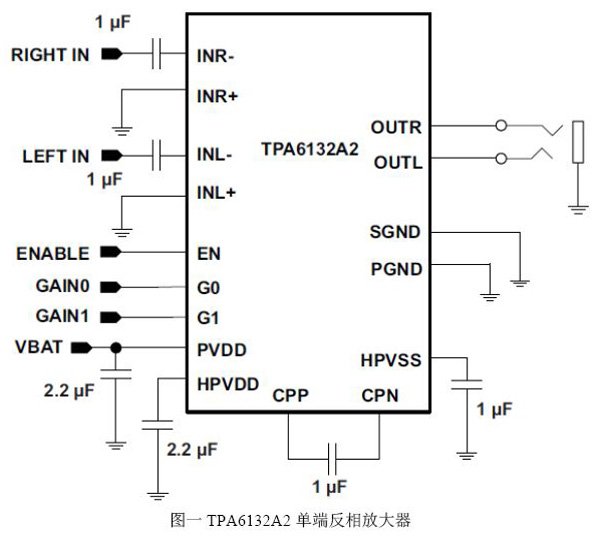 TI提供的TPA6132A2,因?yàn)槠?00dB 的高信噪比,0.01%的低失真度,出色的消除POP聲的能力,以及極高的性?xún)r(jià)比,在手機(jī)等移動(dòng)設(shè)備中,得到了廣泛的應(yīng)用。由于移動(dòng)設(shè)備芯片的集成度的提高,越來(lái)越多的芯片組選擇了單端的連接方式作為耳機(jī)通道輸出。TPA6132A2 同時(shí)提供了差分,以及單端反相放大的連接方式。但由于一些應(yīng)用,例如需要配合其他播放設(shè)備使用,對(duì)于輸出的相位有嚴(yán)格的要求,因此需要以正向的單端放大器的連接方式連接TPA6132A2。本文將討論TPA6132A2 的正向單端放大器的連接方法,以及需要注意的事項(xiàng)。