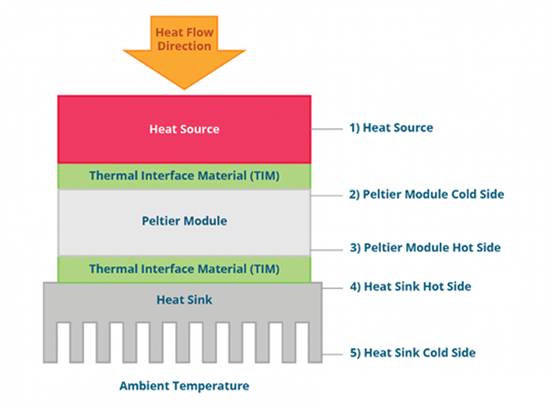 圖4所示即為熱源和散熱器之間的熱能流動。CUI Devices提供一系列標(biāo)準(zhǔn)型和微型珀爾帖模塊,可適應(yīng)高達+77°C的溫度梯度。