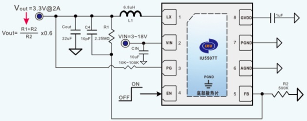 IU5507T是一款由基準(zhǔn)電壓源、振蕩電路、比較器、PWM/PFM控制電路等構(gòu)成的CMOS降壓DC/DC調(diào)整器。利用PWM/PFM自動(dòng)切換控制電路達(dá)到可調(diào)占空比,具有全輸入電壓范圍(3V-18V)內(nèi)的低紋波、高效率和大輸出電流等特點(diǎn)。