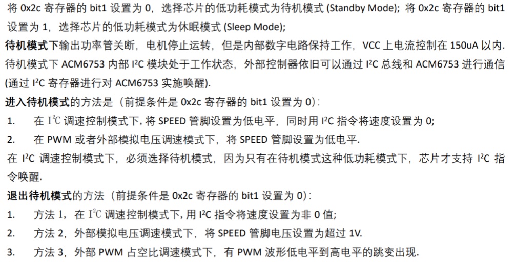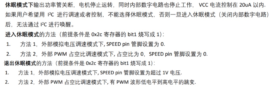 如果對(duì)功耗不是追求極致,可以接受150uA的待機(jī)電流,可以用待機(jī)模式,建議“SPEED管腳下拉到地”, 所有調(diào)速/方向控制/剎車控制都由I2C控制.