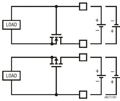 處理電源電壓反轉(zhuǎn)有幾種眾所周知的方法。最明顯的方法是在電源和負(fù)載之間連接一個二極管,但是由于二極管正向電壓的原因,這種做法會產(chǎn)生額外的功耗。雖然該方法很簡潔,但是二極管在便攜式或備份應(yīng)用中是不起作用的,因為電池在充電時必須吸收電流,而在不充電時則須供應(yīng)電流。另一種方法是使用圖 1 所示的 MOSFET 電路之一。