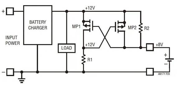 盡管比 NMOS 方法簡單,但是該電路還有一個很大的缺點。雖然它始終提供針對反向電壓的保護(hù)作用,但是它可能不會總是將電路連接到電池。當(dāng)柵極如圖所示交叉耦合時,該電路形成了一個閉鎖存儲元件,此元件有可能選擇錯誤的狀態(tài)。雖然難以實現(xiàn),但存在這樣一種情況:充電器正在產(chǎn)生電壓 (比如 12V),在一個較低的電壓 (比如 8V) 附聯(lián)電池,電路斷開連接。