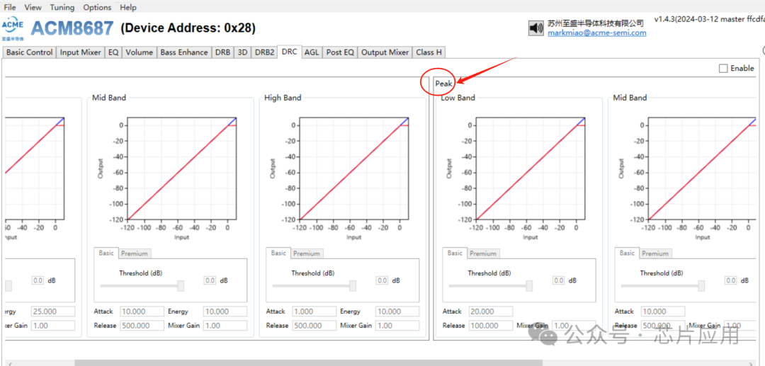 另外一個弊端例如傳統(tǒng)DRC信號突變時,前幾個波形失真的問題。由于傳統(tǒng)DRC是計算RMS,必然有幾個周期的波形是可能失真的。ACM8687除了RMS DRC之外,采用專利技術(shù),加入PEAK檢測。信號經(jīng)過peak加權(quán)后跟RMS值比較,決定先進入peak DRC還是RMS DRC。例如前幾個波形失真問題,可以通過調(diào)整peak DRC的attack來調(diào)整失真。