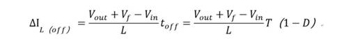 當(dāng)開(kāi)關(guān)管截止,二極管D處于導(dǎo)通狀態(tài),儲(chǔ)存在電感L中的能量提供給輸出,流經(jīng)電感L和二極管D的電流處于減少狀態(tài),設(shè)二極管D的正向電壓為Vf,開(kāi)關(guān)管截止時(shí),電感L兩端的電壓為Vout+Vf-Vin,電流的減少部分△ILoff滿(mǎn)足下式。