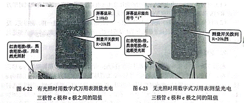 若采用數(shù)字式萬用表檢測(cè),則可將測(cè)量開關(guān)置于R×20k擋,紅表筆接c極,黑表筆接e極,有光照時(shí),屏幕顯示的電阻值應(yīng)在10kQ以下;無光照時(shí),屏幕顯示的數(shù)字應(yīng)為溢出符號(hào)“1”,如圖6—22、圖6—23所示。