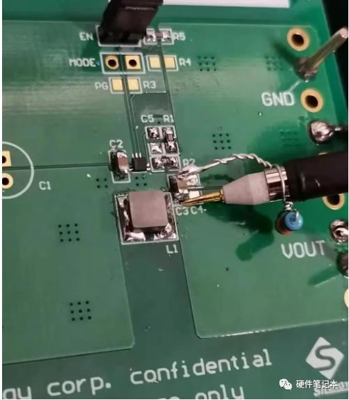 但這仍然不是真正的開(kāi)關(guān)穩(wěn)壓器的輸出紋波。這是因?yàn)槭静ㄆ鞯奶綔y(cè)尖端測(cè)量的是EVB板的輸出,其到開(kāi)關(guān)穩(wěn)壓器的輸出之間的走線存在著寄生電感。為了測(cè)量開(kāi)關(guān)穩(wěn)壓器真正的輸出紋波,我們建議改為直接在輸出電容上進(jìn)行探測(cè),如圖7所示。