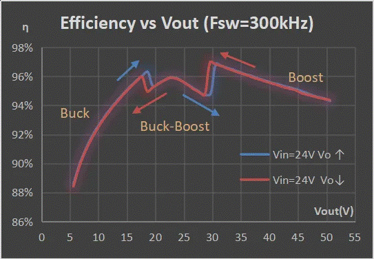 DIA89360能夠在降壓、四開關(guān)升降壓、和升壓工作區(qū)之間平穩(wěn)地轉(zhuǎn)換。